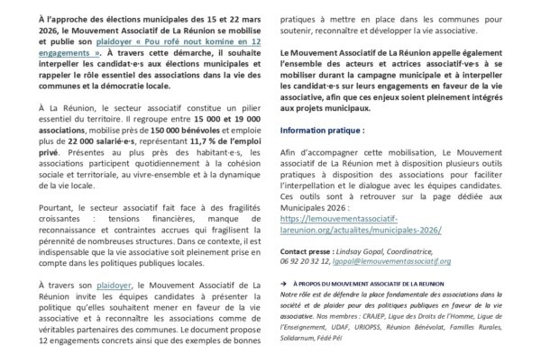 À l'approche des élections municipales 2026, le Mouvement associatif de La Réunion souhaite attirer l'attention sur la place des associations dans les communes à travers…