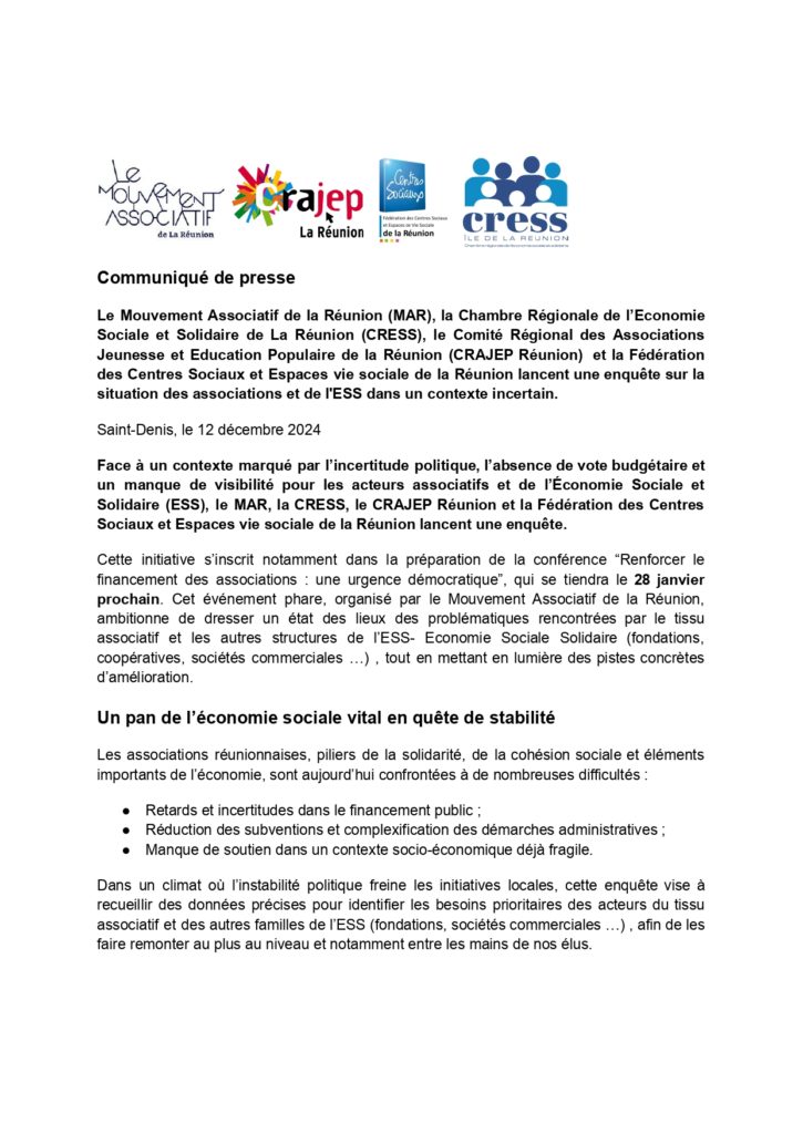 Le Mouvement associatif de La Réunion s’alarme de l’arrêté préfectoral publié en ce début d’année annonçant la réduction du taux de financement des Parcours Emploi…