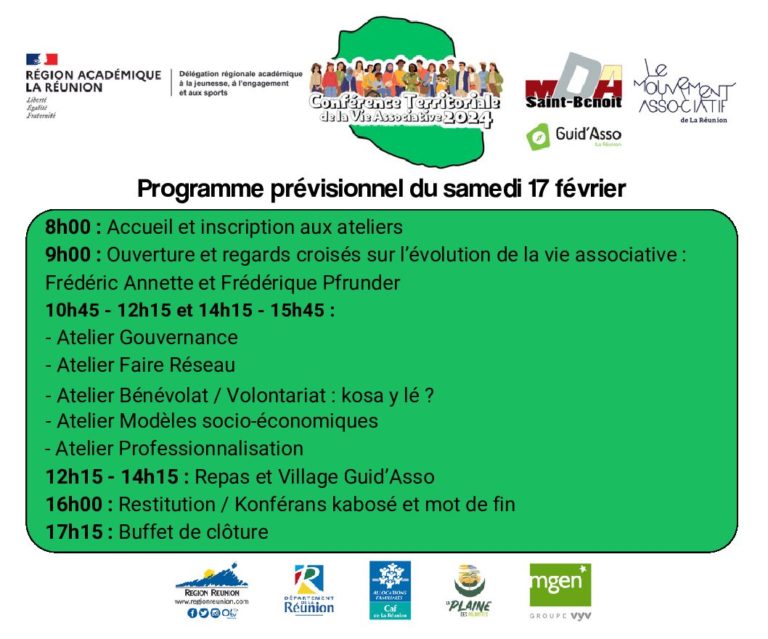 Un événement co-organisé par le Mouvement Associatif de La Réunion, la DRAJES et la Maison des Associations de Saint Benoît, avec le soutien de la Région, le Département, la CAF, la MGEN, la commune de la Plaine des Palmistes.