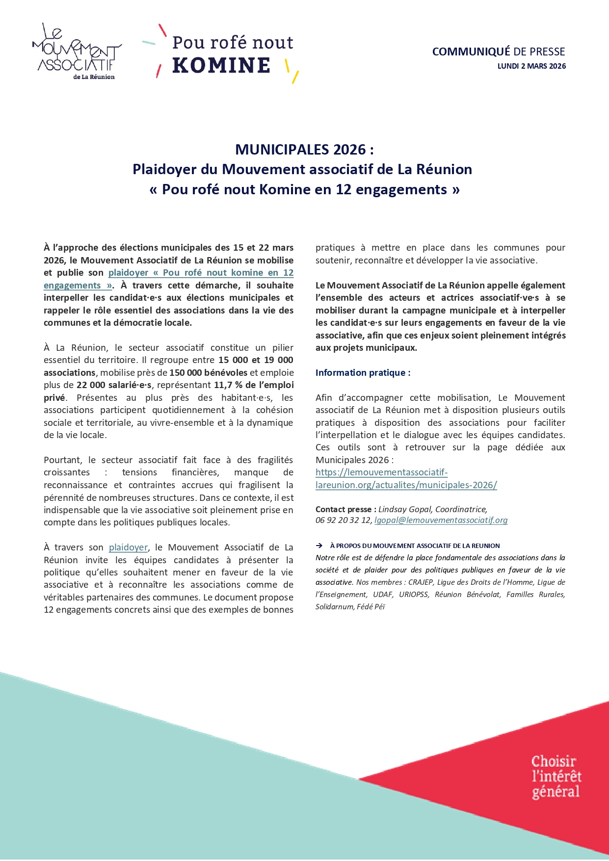 Le Mouvement associati de La Réunion appelle également l’ensemble des acteurs associatifs à se mobiliser et à interpeller également les candidats sur leurs engagements en faveur de la vie associative.